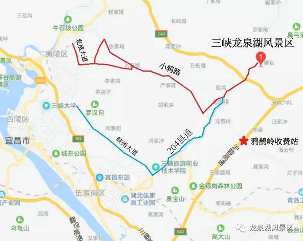 3.外地方向:导航至鸦鹊岭收费站-小鸦路-204县道-三峡龙泉湖风景区