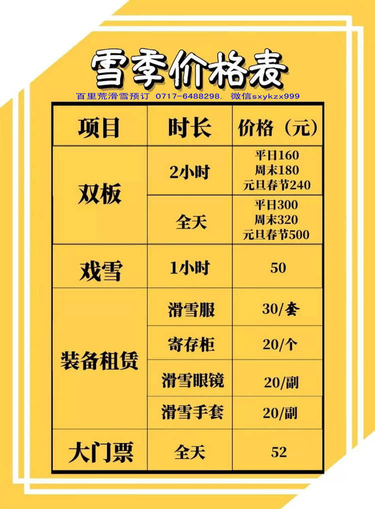 1、以上为滑雪消费项目参考价格,如有出入,请以百里荒滑雪场公布为准。