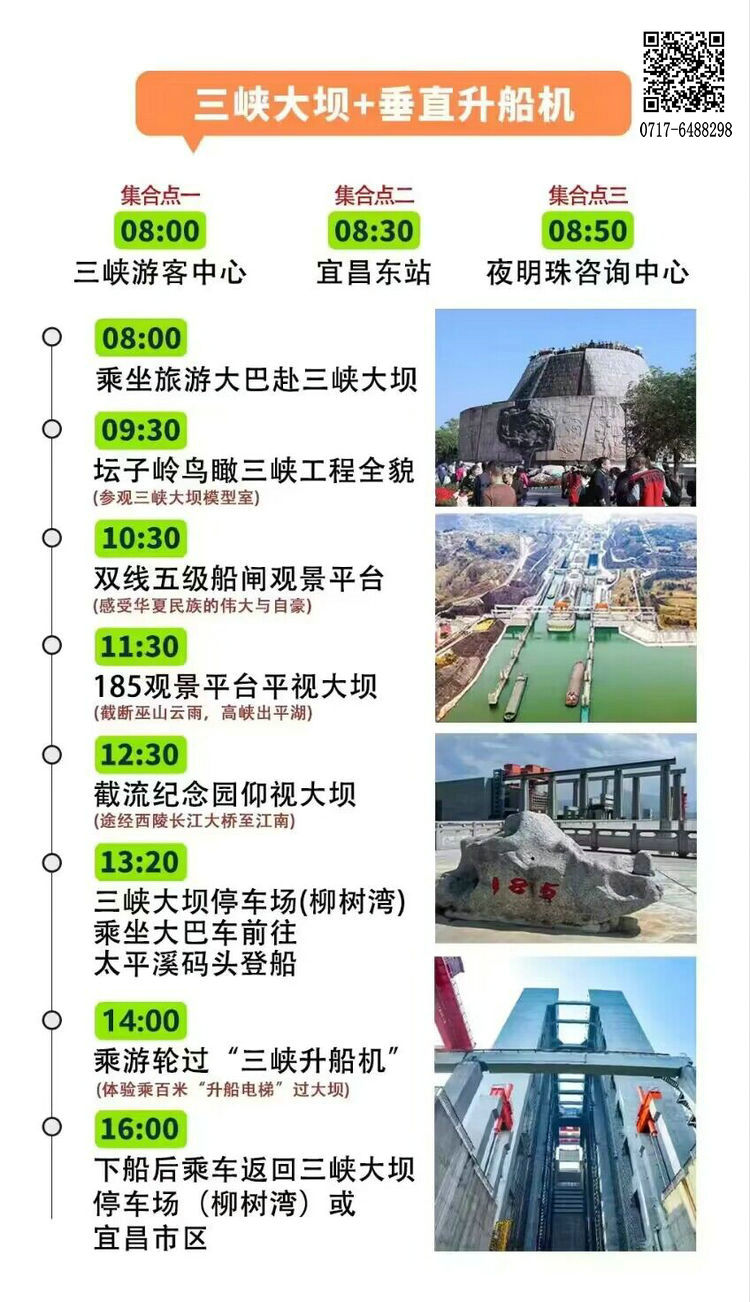 08:00 宜昌三峡游客中心,08:30 宜昌东站乘车出发,10:00参观三峡大坝,