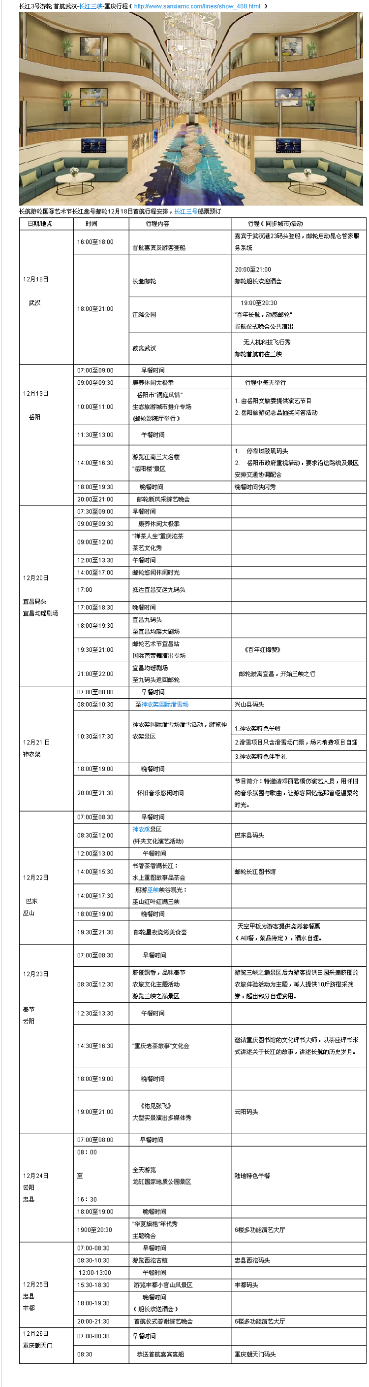 长航游轮国际艺术节长江叁号邮轮12月18日首航行程安排表