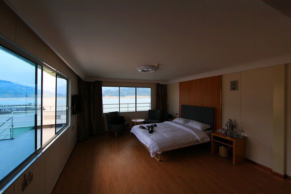 1、观景房共4间,分别设在一楼二楼的最前部,房间正前方和靠外走廊的侧面均设有1.2m*2.4m的超大窗户,游客在房间内足不出户即可欣赏长江三峡的秀美风光。