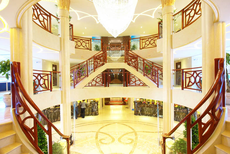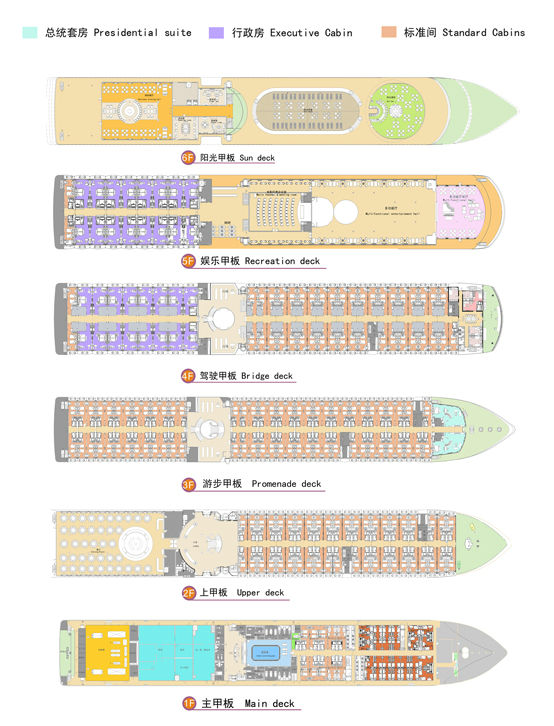 拥有直达阳光甲板的全镂空透明大堂、两部从大堂直通顶层的观光电梯,五楼多功能厅分动吧、静吧两个区域,人均公区面积、舒适豪华程度为长江之最。