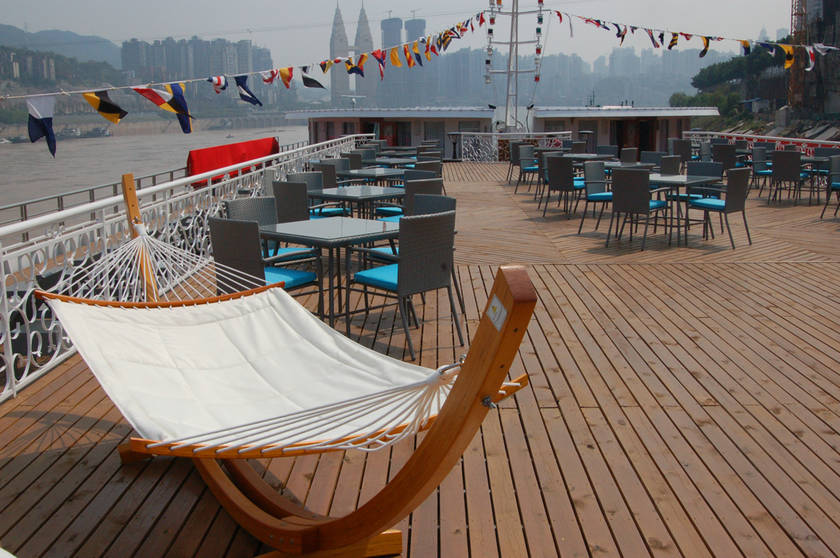 游轮顶层露天甲板分日光浴区、露天烧烤区、露天表演区、慢跑道,可满足游客多方面的要求。