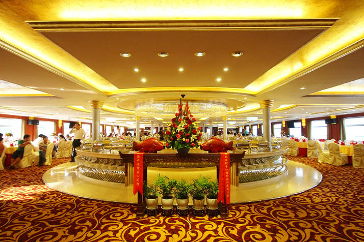 游船上首创式双圆弧造型设计的自助餐台既独特美观,又方便客人取餐。餐厅内的弧形舷窗可根据需要向上开启,进行空气循环。