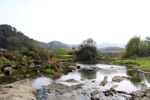 在村口,大家眼前看到的小山峰,请大家发挥您的想象,它像什么?对,一只龟,从头到脚都十分像的龟,传说它是观音娘娘派驻的特别巡视员,用以监督青龙湾里调皮的九条龙,青龙湾九条青龙的故事传说及景点在观音座,我们会详细讲解,先说神龟,它奉命监督九龙是祸害一方,还是积德行善,风调雨顺,保佑四方百姓。神龟始终望着溪流,因为龙在水中,它恪尽职守,守护着青龙湾,同时它也望着大门,欢迎远方的客人,送上默默的祝福。张艺谋也喜欢这里景色,在这里拍过一场戏——静秋在河里给老三洗衣服。