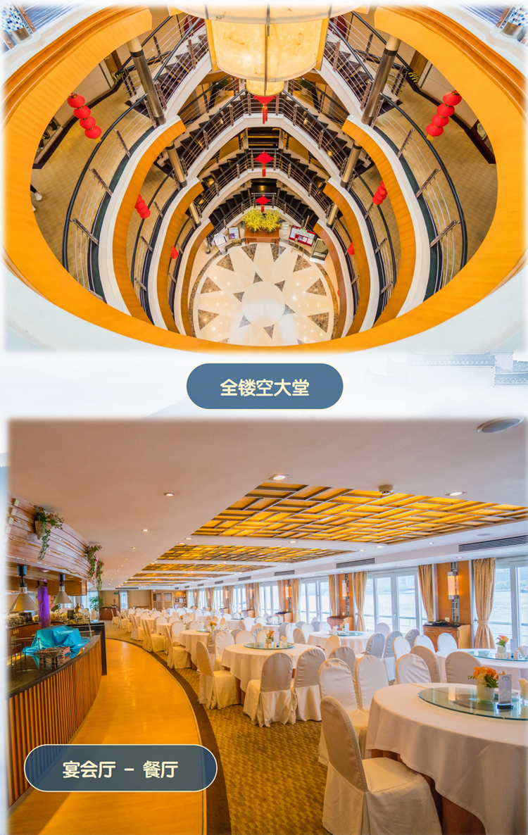 三、长江印象号服务设施:设备齐全的公共区域 新世纪游轮一贯秉承为游客提供高品质的游轮休闲度假享受,因此尽管我们的游船是目前长江三峡最大的游船,但是我们的载客量却不是最多的,将更多的空间留出来让游客享有更加宽阔的娱乐休闲时光,甚至于将两整层甲板空间留出来用做公共空间,我们用心地“舍去一些房间”,让客人倍感休闲舒适。