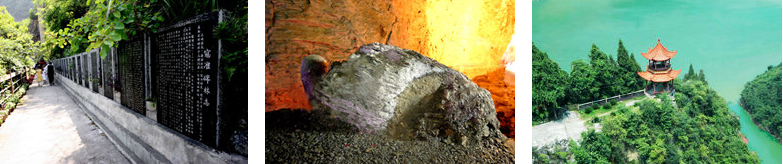 【寇准碑林】 寇准在巴东任知县时,写了不少诗词,总计有125首,亲编为《巴东集》,珍藏在北京大学图书馆。他一生共写了293首诗词,在巴东三年写的近占一半。三峡的奇山异水,特别是无源洞风光孕育了他不少的创作灵感,壮丽而秀美的三峡风光激励了他,有志报国的人生目标。在中国历史上他以政治家兼诗人著称;在北宋王朝内部集权外部软弱的状态下,他以刚直的性格主张抗战收复在五代时期流失的燕云三十六州国土;在宋辽澶渊之战中,他以宰相身份主真宗皇帝御驾亲征并取得首战胜利,奠定了澶渊之盟后北宋王朝百余年和平的基础。寇准在巴东的三年主要是到野三关劝农,引导土家人放弃打猎从而发展农耕文明,减轻官税,明白断案,兴修白云秋风双亭,闲暇寄情山水吟诗作赋。他一生宦海沉浮,三起三落,63岁贬往广东雷州任司户参军闲职,死后昭雪,归葬西京洛阳,途径湖北公安县,老百姓插竹挂纸钱,祭哭于路,一个月后挂纸钱的枯竹长出了笋子,可谓感动天地……公安、巴东一带至今留传枯竹生笋这一传说。