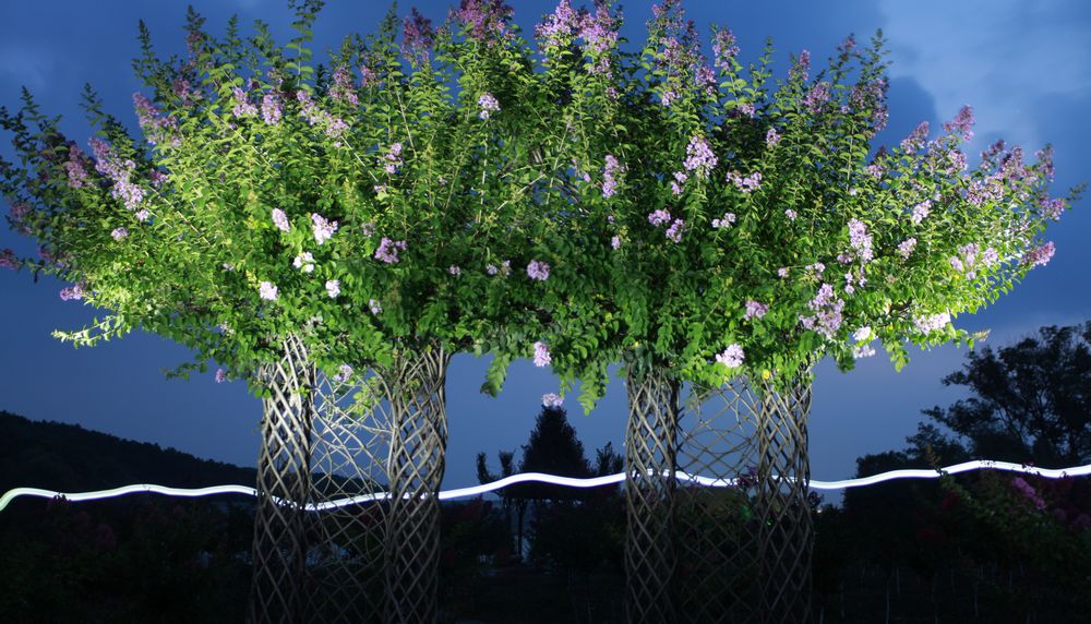 万紫千红植物园种植面积2000亩,各类紫薇120万株,其中百年以上紫薇3000余株,500年以上的近200株,千年以上是20多株,一株紫薇王树龄达到1300年以上,源于唐朝,是园区的“镇园之宝”。其中一株紫薇,花色有紫色、桃红色、粉红色和白色。围绕“树王“对称分布着8棵800—1000年的古老紫薇,一树双花、一树多花、均是看点。