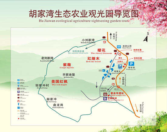 胡家湾樱花园是都市人节假日休闲旅游观光、采摘体验、会议展览的天然氧吧和农家乐园。每逢春季园区内万亩樱花竞相开放,姹紫嫣红。您还可观赏到桂花、紫薇、红枫、红叶石楠、双面红继木、红豆杉等树种。山脚下紫金寺遗址旁有一颗千年古银杏,枝繁叶茂与木鱼山遥相呼应,成为当阳一大美景。