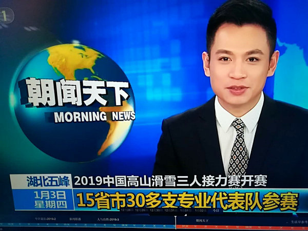 中央电视台朝闻天下 对五峰国际滑雪场高山接力赛 滑雪赛事的报道