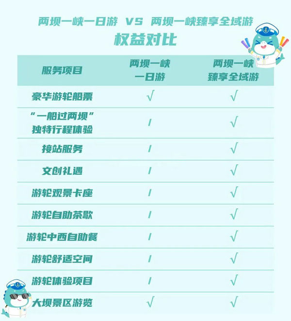两坝一峡一日游和臻享全域游升船机一日游内容对比
