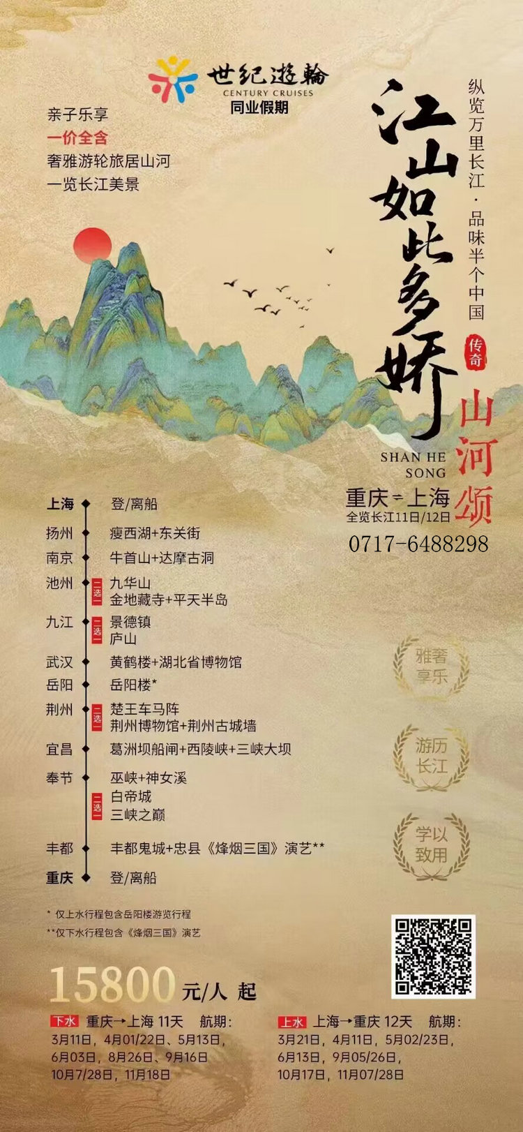 世纪传奇游轮游长江,上海出发乘船到长江三峡、重庆12日游,南京+扬州+庐山+武汉+长江三峡+重庆航线。上海出发游长江,万里长江万里景,万里江山万里行。