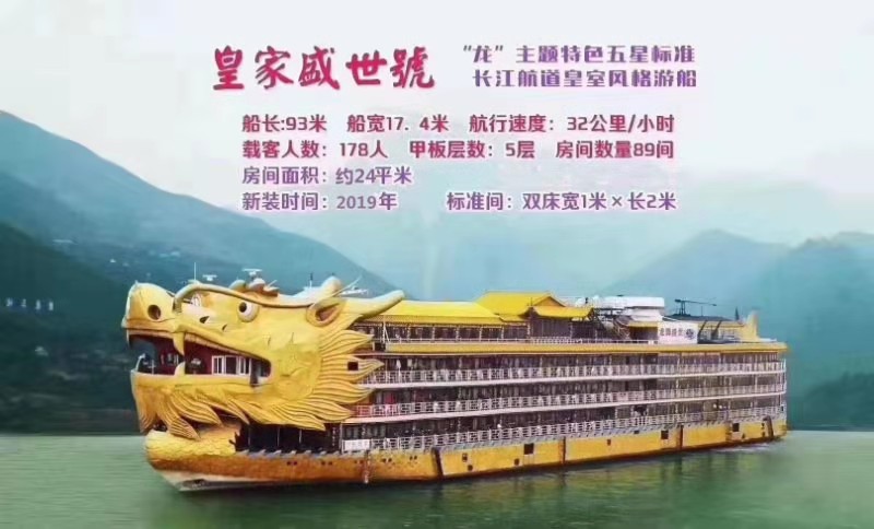 【皇家盛世乾隆号三峡龙船介绍】:长江上一艘中国清朝皇室风格的豪华主题游船,深得海外游客喜爱。2019年游轮公司投巨资重新装修了皇家盛世乾隆号,别具一格的船体,恰似文言豪放的巨龙,烘托出华夏人炙烈的图腾崇拜和龙的传人执著的民族精神。船上花团锦簇的衣食住行,金碧辉煌的古建筑装饰,完全再现朝廷生活的规范服务,无一不突出清代鼎盛时期帝王的权利、享乐和奢华。