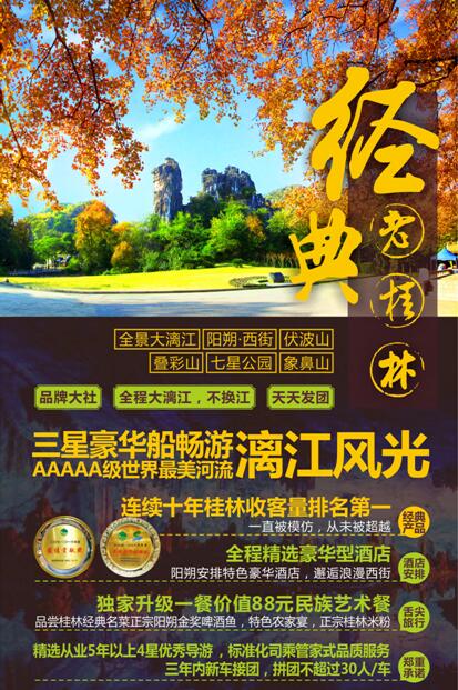 宜昌到桂林、大漓江双卧五日游最经典的旅游线路,包含桂林山水的精华核心部分:叠彩山、伏波山、象鼻山、七星公园,奇山秀水美丽风光更让您仿佛置身于“船在山中走,人在画中游”的梦境中—AAAAA全景大漓江。