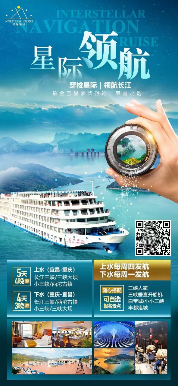 五星豪华游轮星际领航航线为宜昌茅坪港-重庆朝天门,上水宜昌出发行程为五天四晚(每周五),下水重庆出发为四天三晚(每周二),游轮船票固定包含免费景点为三峡大坝+小三峡+双桂山,另外随心搭配可选景点为三峡大坝升船机、三峡人家、小小三峡、白帝城、丰都鬼城。